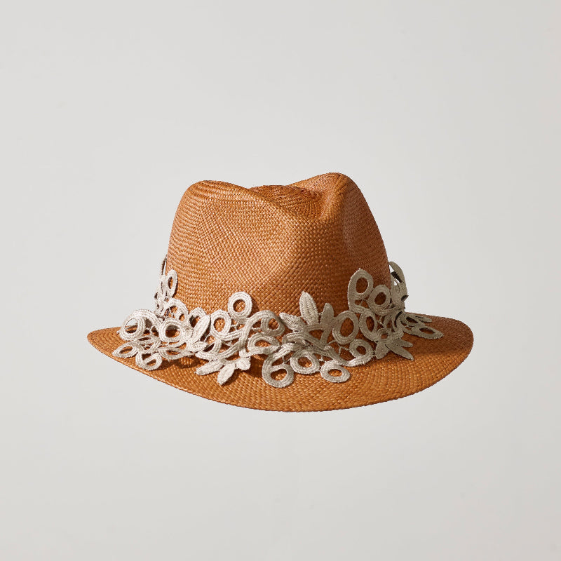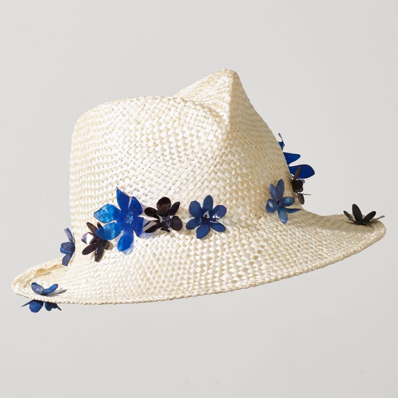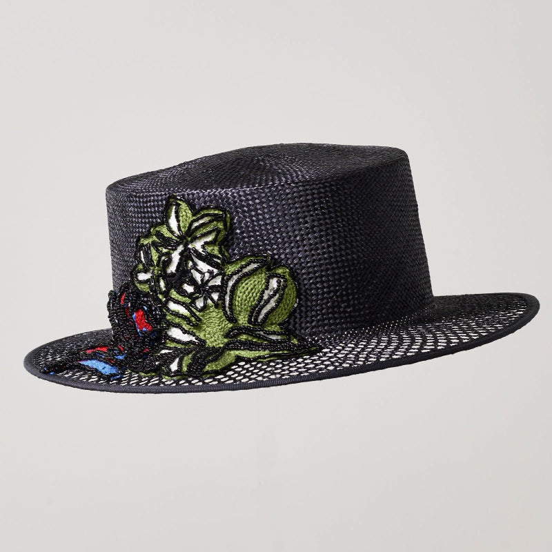 Misa Harada Hats| IVES - UNISEX | Wide-brimmed fedora in twisted black / or red check seagrass, with removable frayed grosgrain tie and mh logo